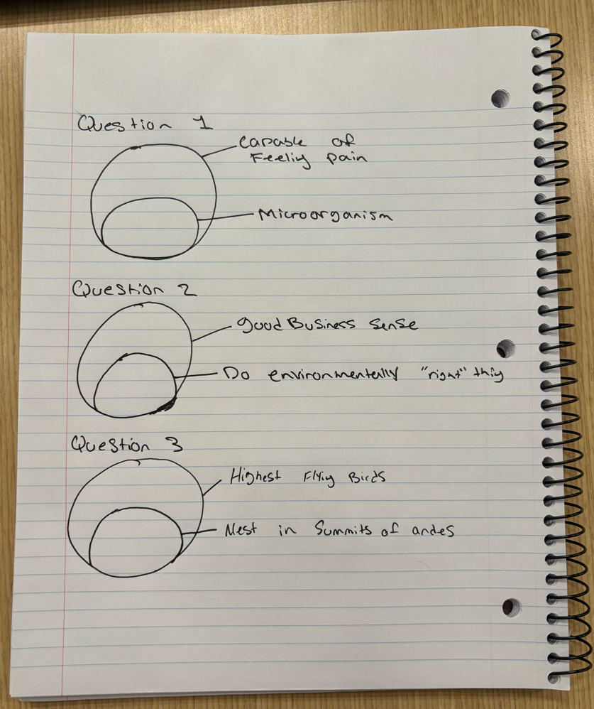 Question 3 is confusing for me as well. I wanted to ask the group a question. How would I diagram the nest in the summit of the Andes and the highest birds of prey nest?
