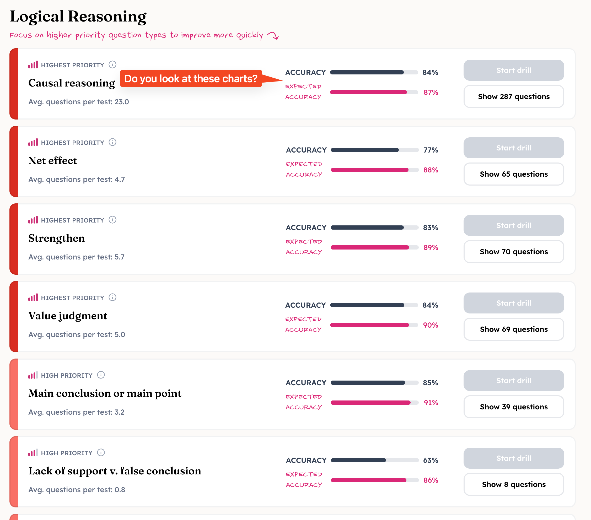 Yes, it is the main way I determine which types of questions to drill. My only question is how expected accuracy is determined (and whether it shifts over time based on drill/PT performance)