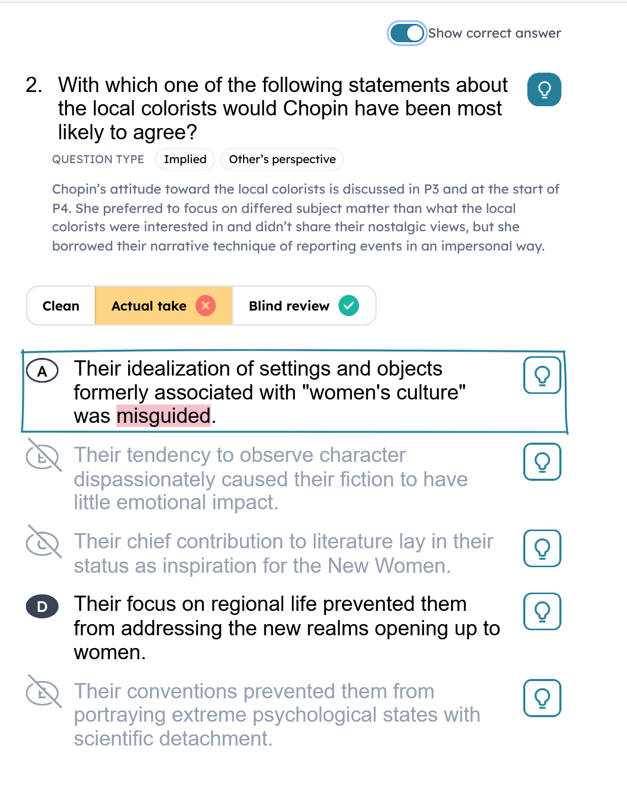 If I do a question or a section and get 100% then I do not have the option for the clean version and it does not show me what I put for the BR. For example this is Q14 which I got correct as an individual question and when I click Review it does not give me the options of clean, actual take and blind review.