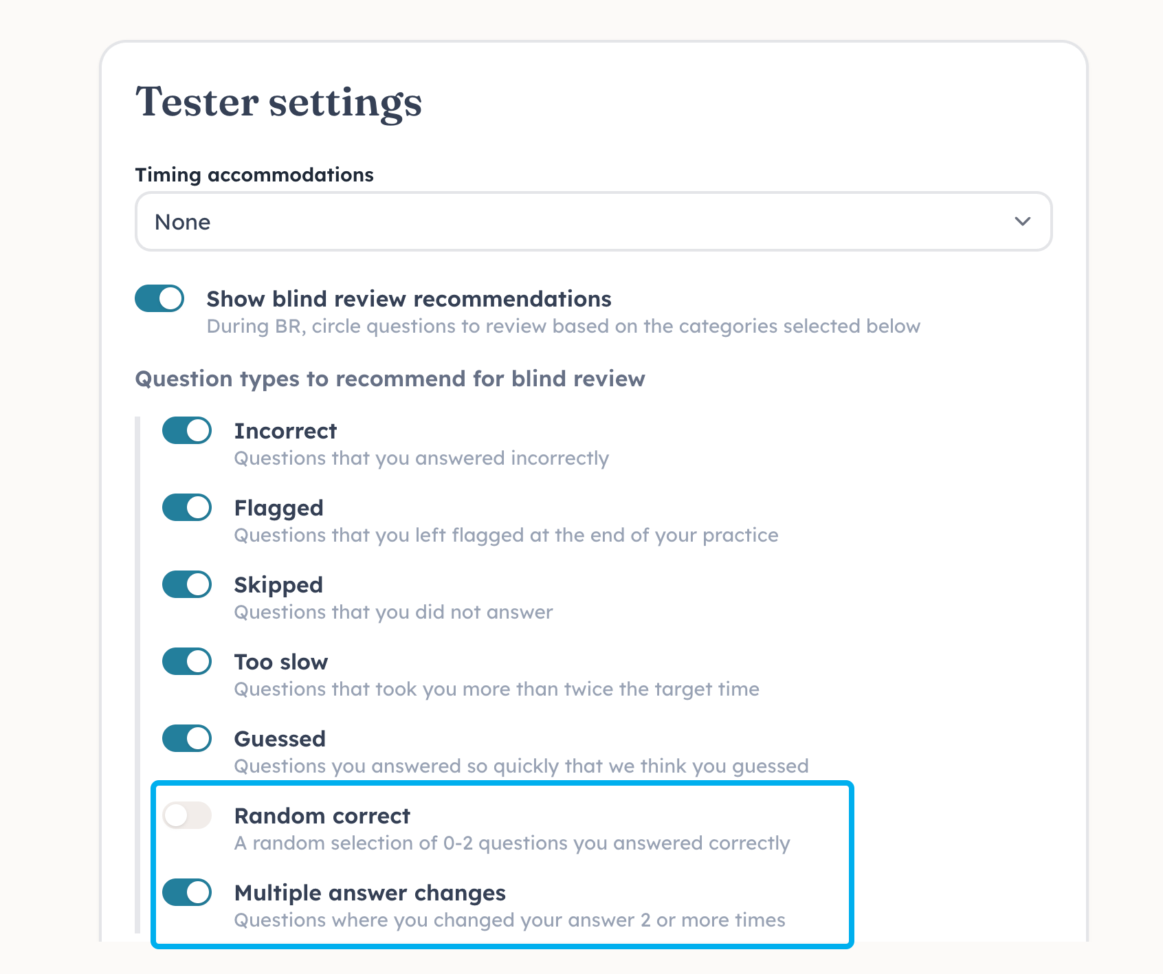 Multiple answer changes. We'll recommend questions where you changed your answer two or more times, since you probably weren't certain of your final answer. The setting is on by default.
