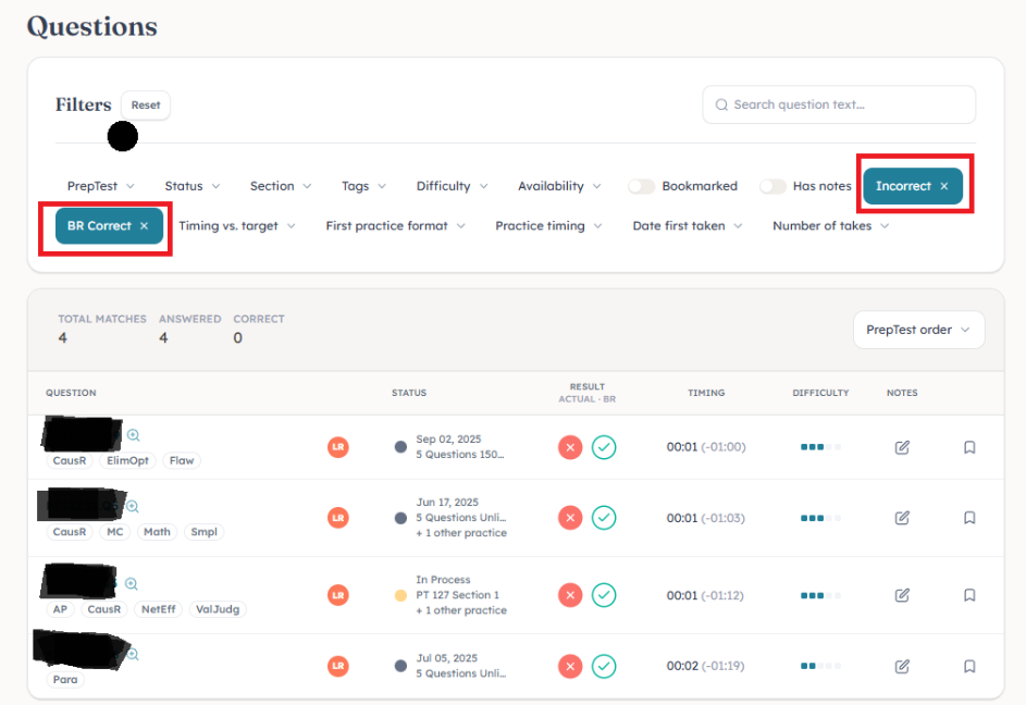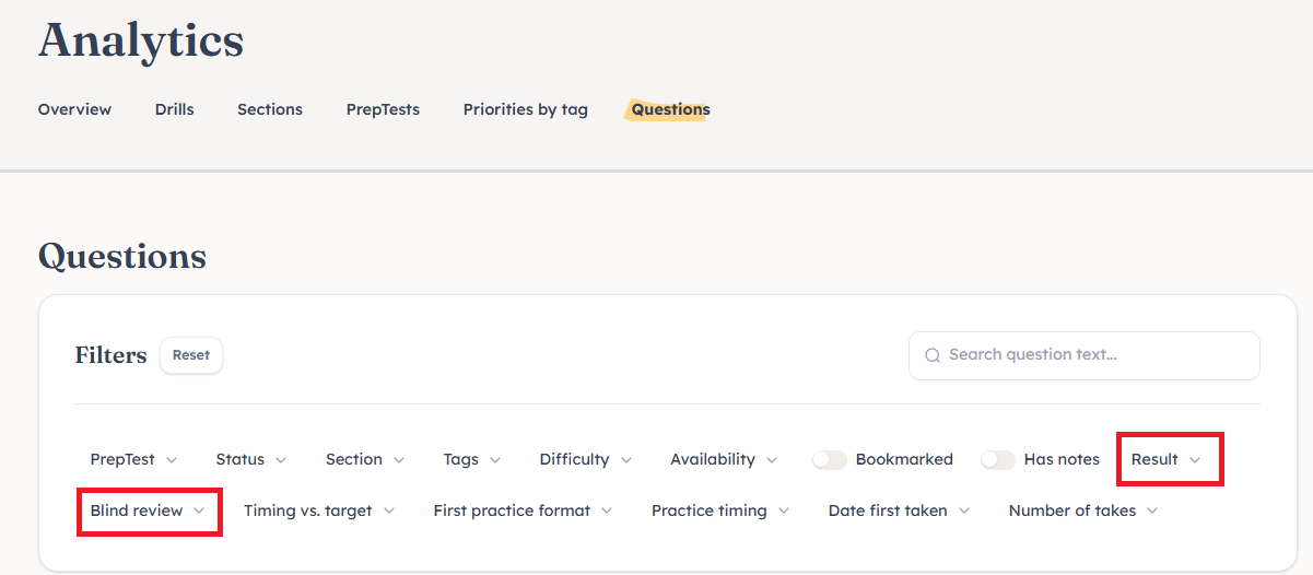 You can actually do this right from the Questions tab in Analytics! Just use the filters together to show questions you got incorrect during the timed section and correct during blind review—you’ll be able to see both your “actual take” and “blind review” answers.