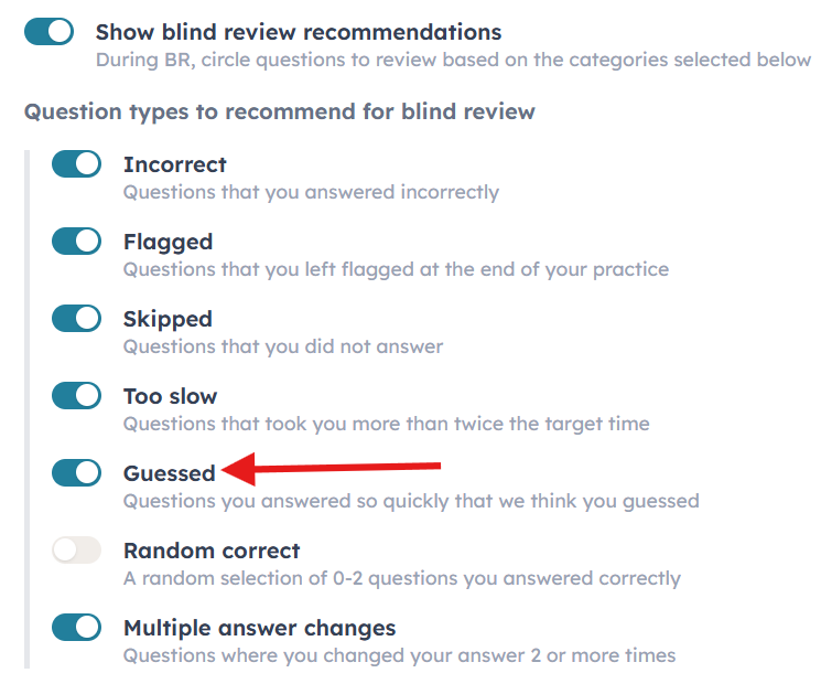 We can recommend questions for blind review if you got them incorrect, skipped them, flagged them, spent too much time on them, or answered them too quickly. This means the questions recommended for blind review can sometimes include ones you answered correctly within the target time.
