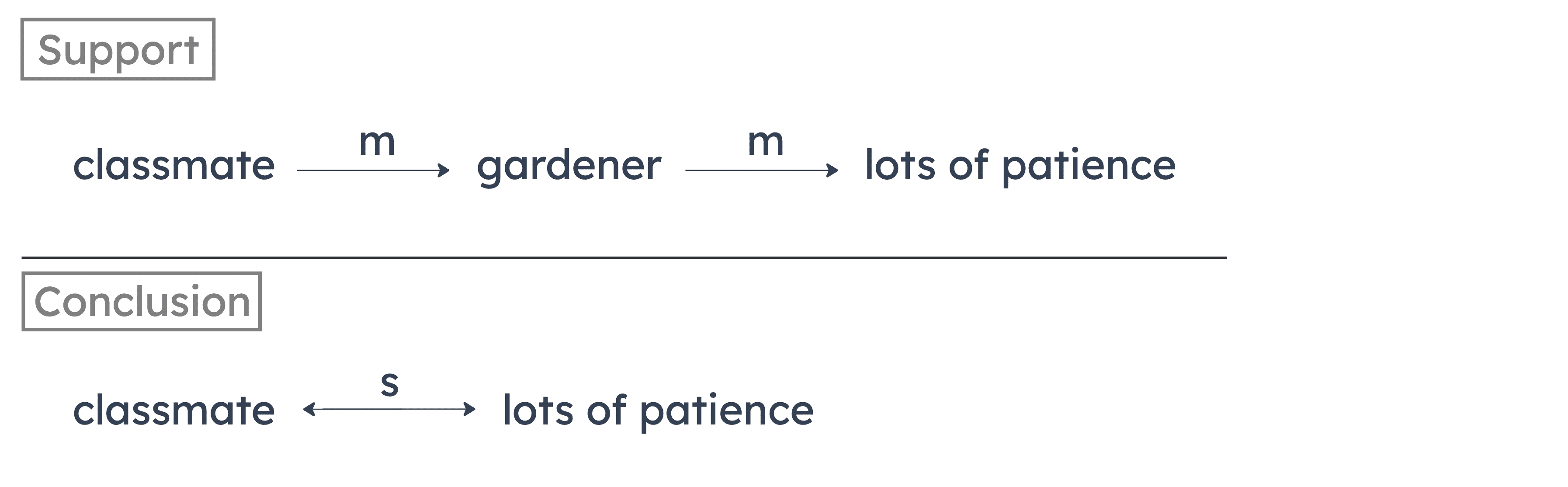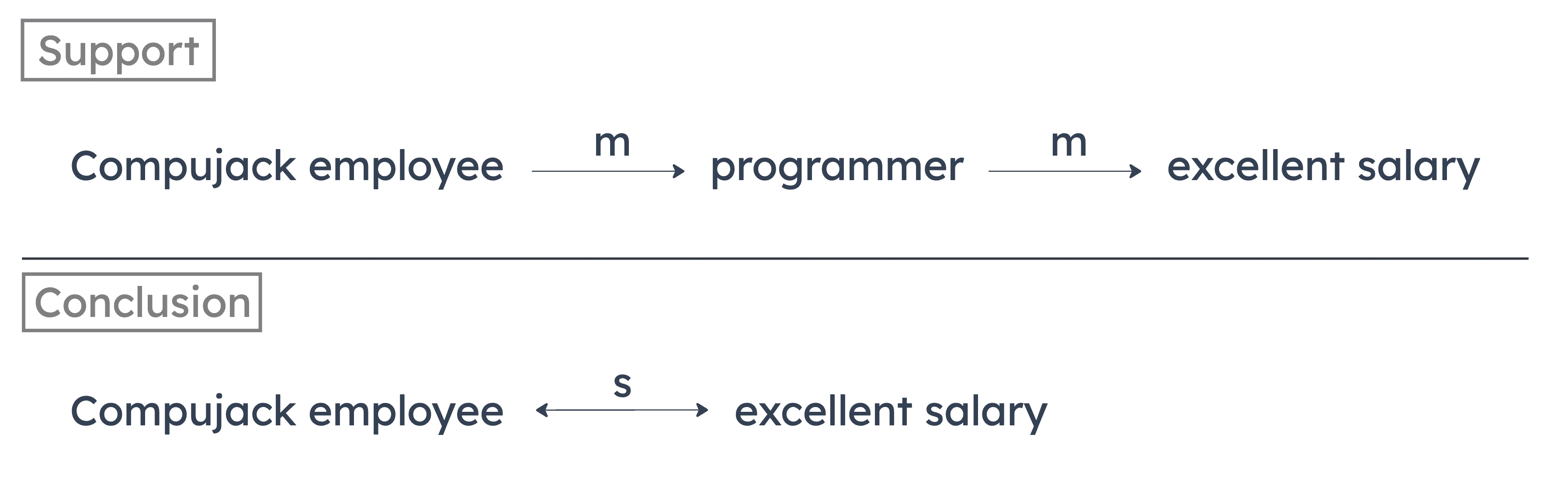 This argument is flawed because it employs an invalid argument form. A “most” statement linked to another “most” statement does not allow you to draw a “some” statement from the first link to the last link (as shown in the diagram above). Just because most employees of Compujack Corporation are computer programmers and most computer programmers receive excellent salaries from their employers, that doesn’t necessarily mean that any Compujack employee receives an excellent salary from Compujack.